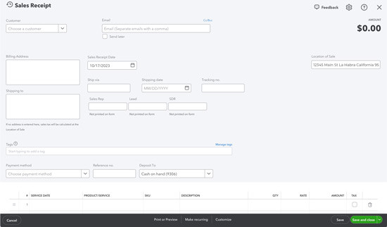 In situations where your business receives payments at the time of product or service delivery, issuing a sales receipt – rather than an invoice – is the way to go. this is also essential for your records. Simply click on the "+New" button in the upper left and select "Sales receipt" under Customers to open a blank form. You'll fill it out in a manner similar to creating an invoice. Start by selecting the customer and proceed to input or select any necessary data for the remaining fields.